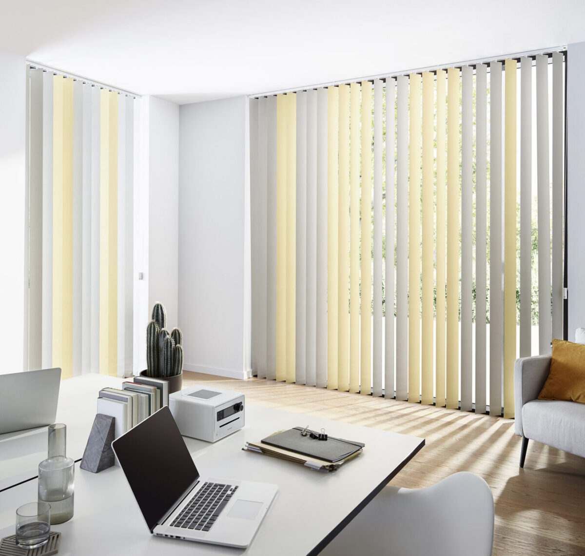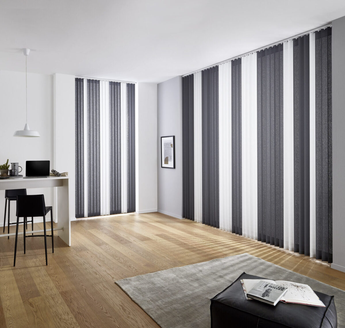 Lamelne zavese lahko v različni kombinaciji barv, širini trakov in različnih materialov, nadomestijo senčila in popestrijo prostor, hkrati pa ga navpične linije lamel lahko optično povečajo.
